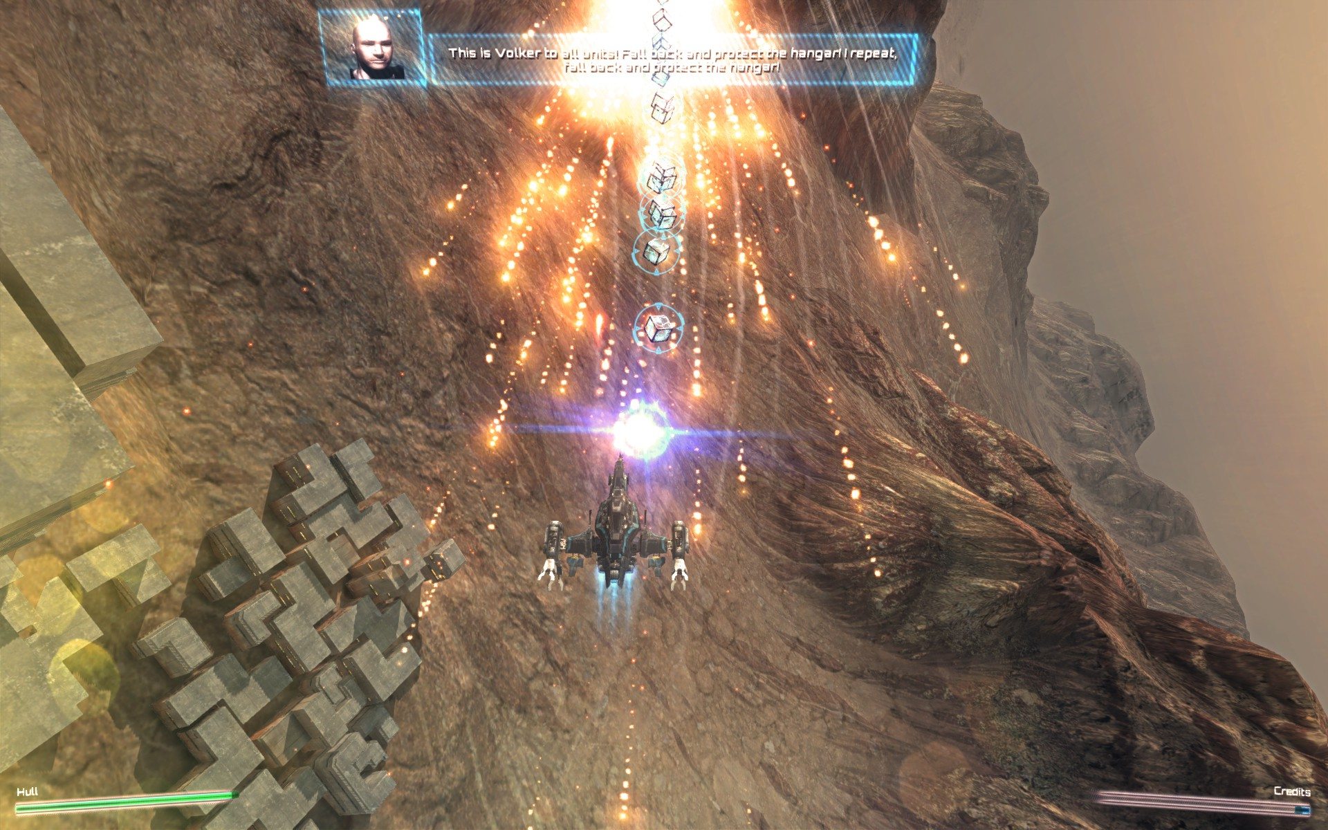 One thing that immediately stuck out as I began my journey through Solar Shifter EX was the lack of power-ups on the stage. Every enemy does drop credits, and these can be used to upgrade your weapons. This choice does detract a bit from the on-the-fly experience, but the cinematic feel of the game makes me think that probably isn’t what they were going for at all. There still isn’t a lot of time to stop and smell the roses though. Three rockets are about all it takes to turn your ship to free-floating scrap, so you still need to be on your toes constantly. The word of the day is vigilance.